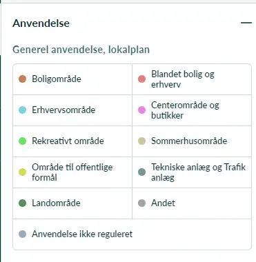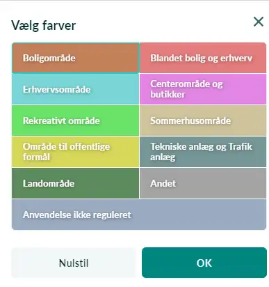 De generelle anvendelseskategorier kan farvelægges efter behov, ved at vælge feltet ”Vælg egne farver” og herefter trykke på de kategorier der ønskes at farvelægges.