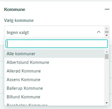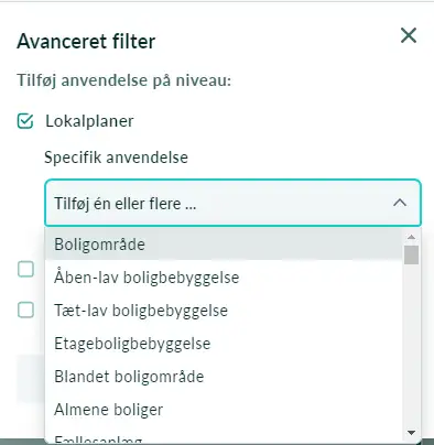 Det muligt at specificerer sin søgning yderligere ved at anvende feltet ”Tilføj flere anvendelsesfiltre”. Her vælges først det ønskede planniveau og herefter den specifikke anvendelseskategori.