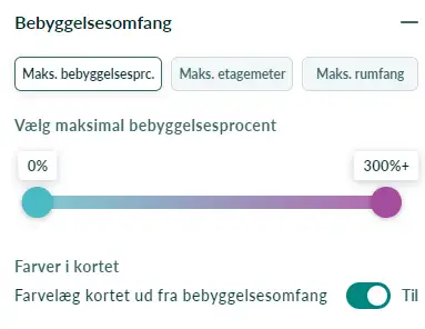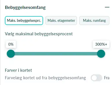 Under denne kategori kan der filteres efter bebyggelsesprocent, etagemeter eller rumfang.