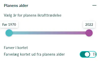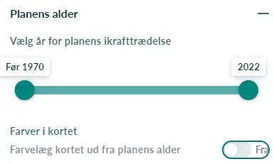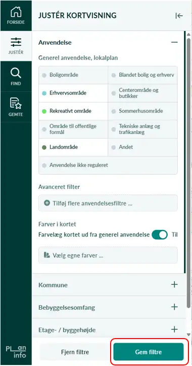 I toppen af venstreside ses en menulinjen, hvor feltet ”Justér” per automatik er valgt. Herunder kan der vælges fem underkategorier (Anvendelse, Kommune, Bebyggelsesomfang, Etage- / byggehøjde og Planens alder). Som default er alle typer lokalplaner med status vedtaget slået til.