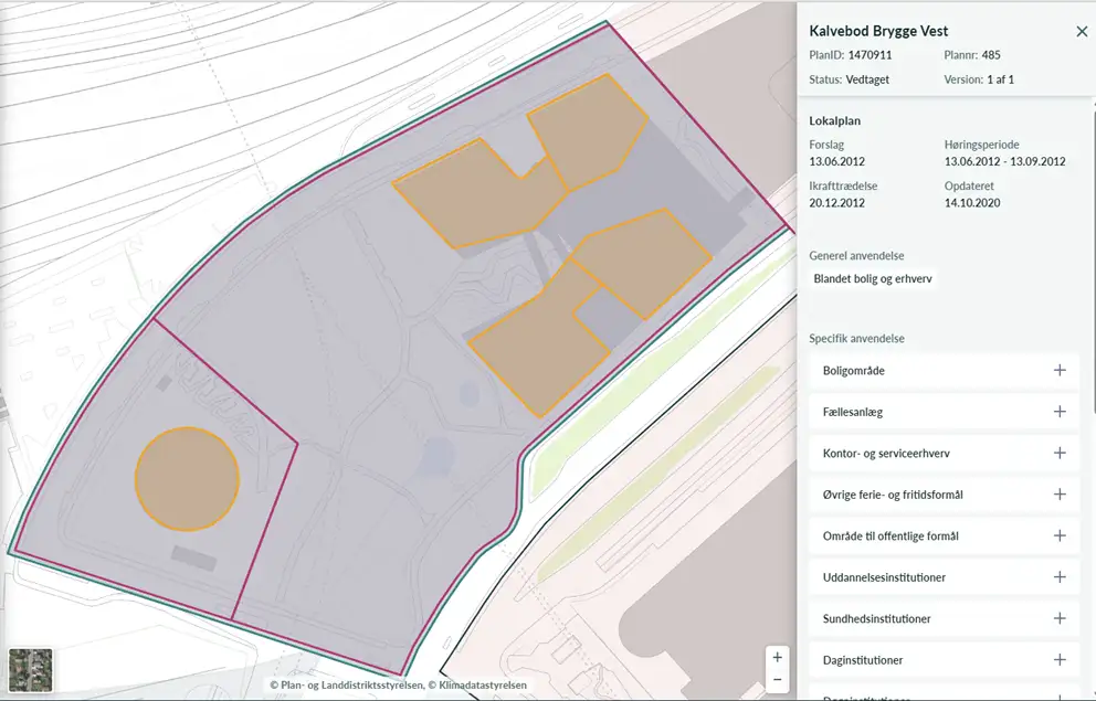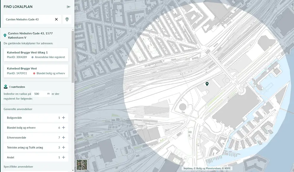 Her er det søgt efter adressen Carsten Niebuhrs Gade 43 også bliver der vist de gældende lokalplaner for adressen. Derudover ses de genelle anvendelser og specifikke anvendelser der ligger inden for området.