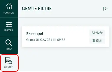 Når man skal finde det gemte filter frem igen, vælges ”GEMTE” i menulinjen. Derefter vise de filtreringer som man har gemt på browseren. Tryk ”Aktivér” på det ønskede filter for at tænde det.