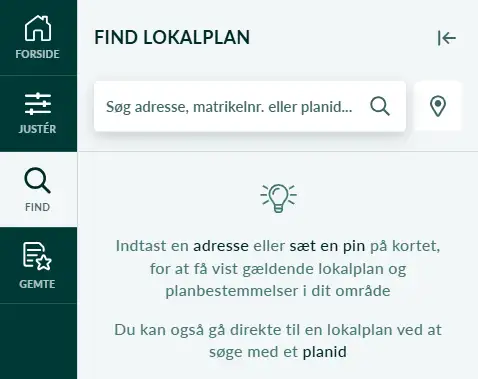 Inden under feltet ”FIND” kan man søge efter adresser, matrikelnr. eller planID for at vist planbestemmelserne i det ønskede område.