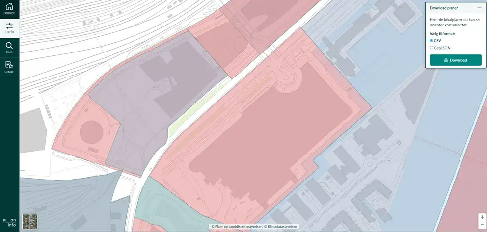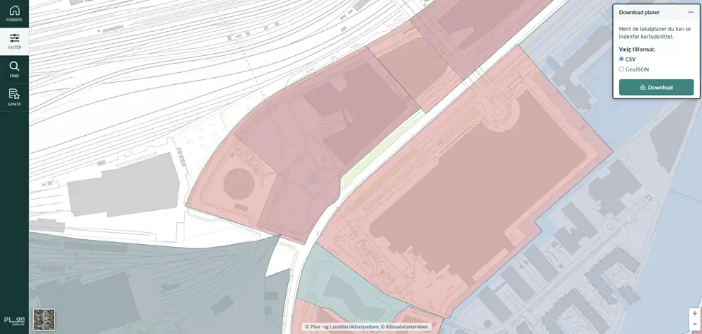 Tryk på ”Download planer” oppe i højre hjørne for at hente de lokalplaner der er inden for kortudsnittet. Beslut om filformatet skal være CSV eller GeoJSON og tryk ”Download”.