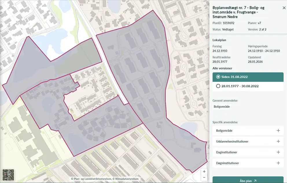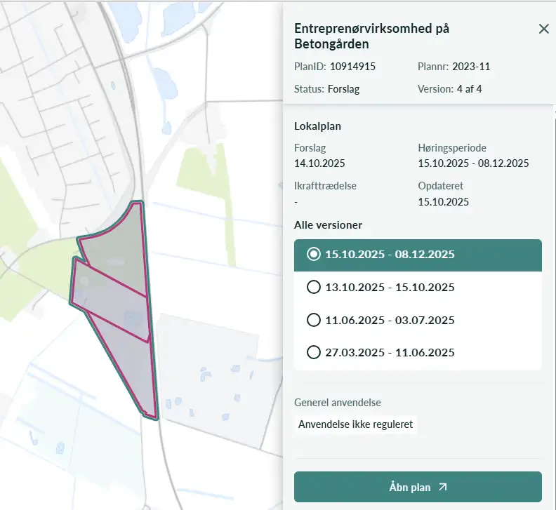 I menuen til højre kan du se de forskellige versioner af lokalplanen og den periode, hvor hver version har været gældende.