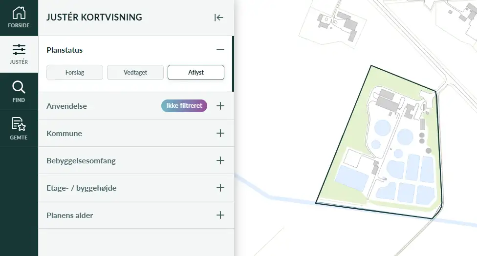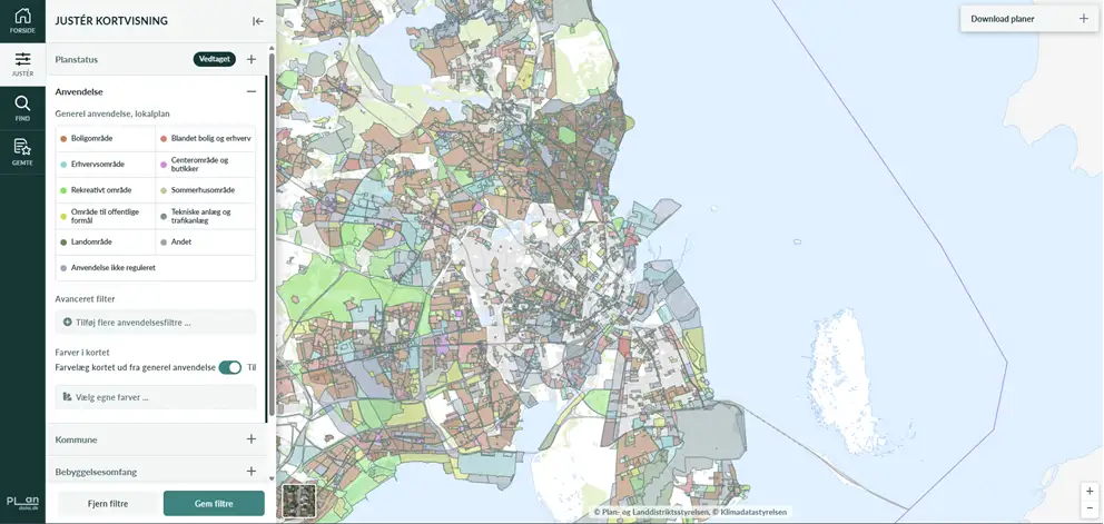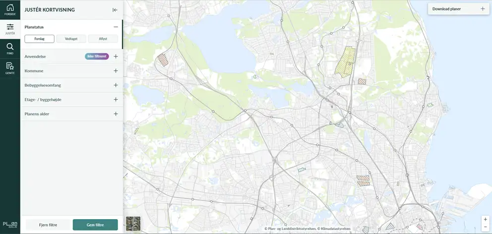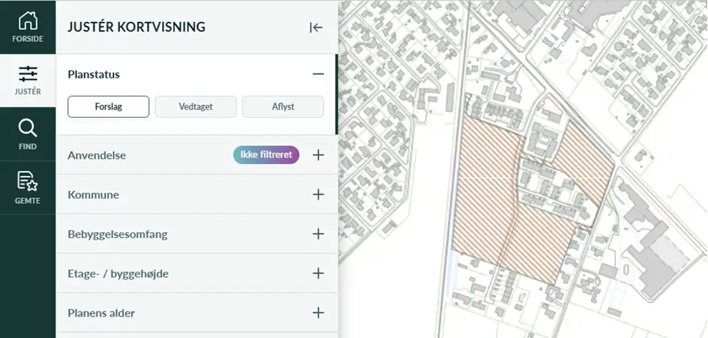 I toppen af venstreside ses en menulinjen, hvor feltet ”Justér” per automatik er valgt. Herunder kan der vælges fem underkategorier (Planstatus, Anvendelse, Kommune, Bebyggelsesomfang, Etage- / byggehøjde og Planens alder). Som default er alle typer lokalplaner med status vedtaget slået til.