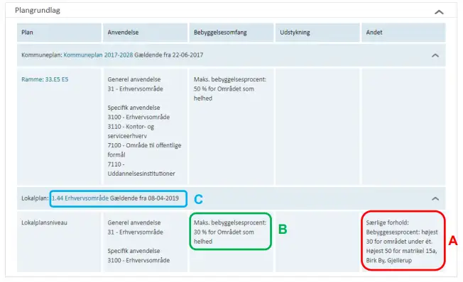 Det er muligt at tilgå et valgt deljordstykke ved at klikke ”Deljordstykke”, Figur 7, B. Ved at klikke ”Vis alle deljordstykker med samme plangrundlag” bliver man ført tilbage til oversigtssiden med deljordstykker, som vil være filtreret til kun at vise deljordstykker med nøjagtigt de samme planid i plangrundlaget – hverken flere eller færre.
