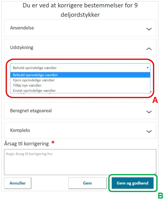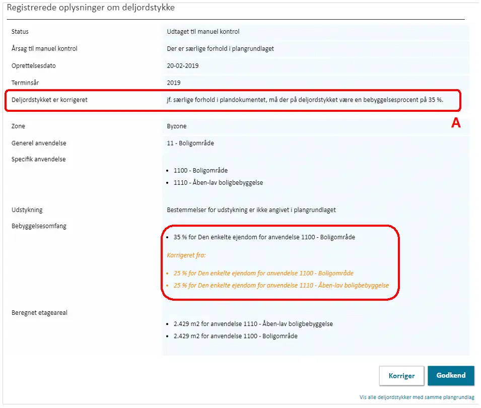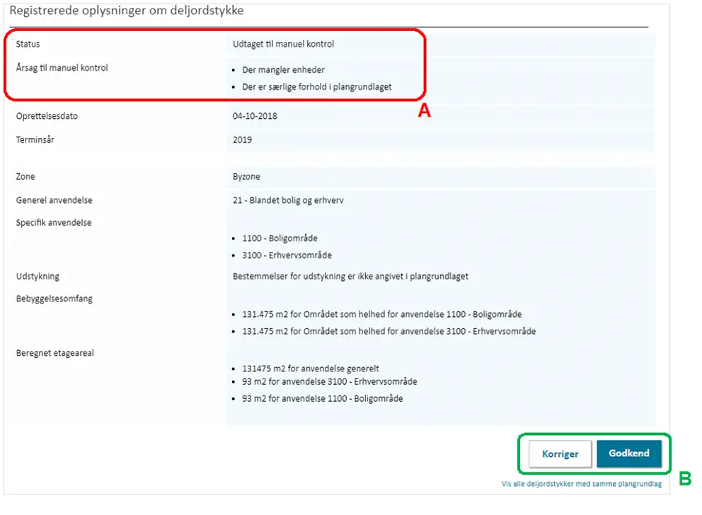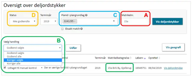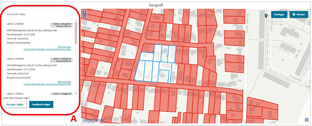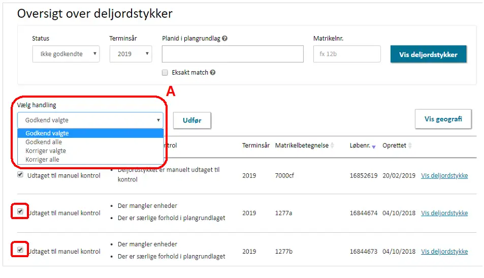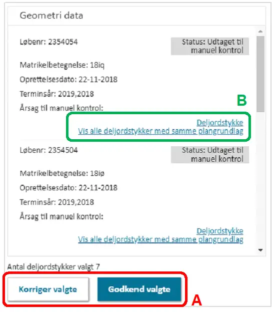 Såfremt de fremsøgte deljordstykker er filtreret efter ikke-godkendte deljordstykker, er det muligt at foretage en ”Korrigering” eller ”Godkendelse” (Afsnit 5.1) af de på kortet valgte deljordstykker, Figur 7, A.