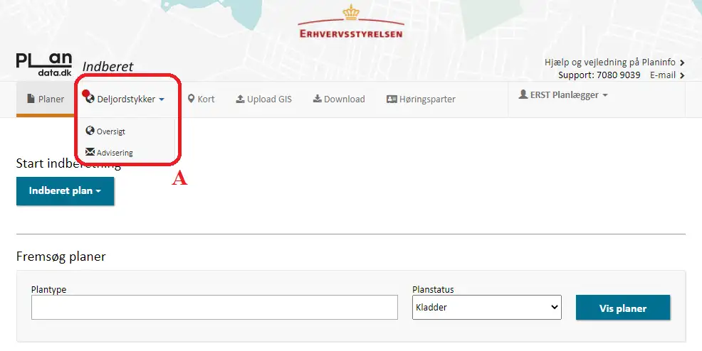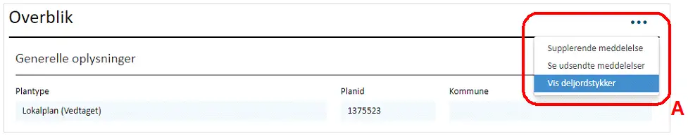 Klik på de tre prikker i det øvre højre hjørne på overblikssiden for en plan, Figur 8, A. Klik derefter på ”Vis deljordstykker”. Herved åbnes en oversigt over de deljordstykker, som ligger inden for den pågældende plans planområde.