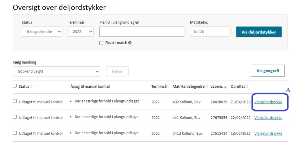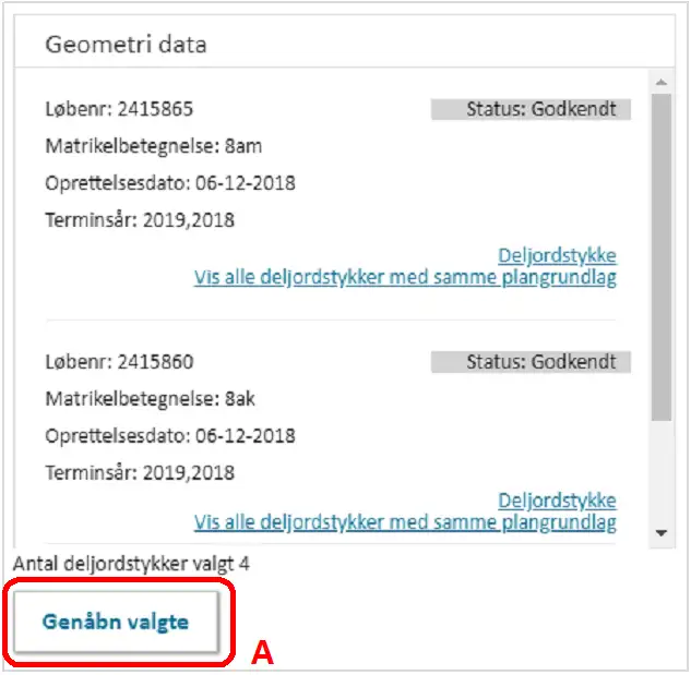Såfremt de fremsøgte deljordstykker er filtreret efter godkendte deljordstykker, er det muligt at foretage en ”Genåbning” (Afsnit 4.2) af de på kortet valgte deljordstykker, Figur 6, A.