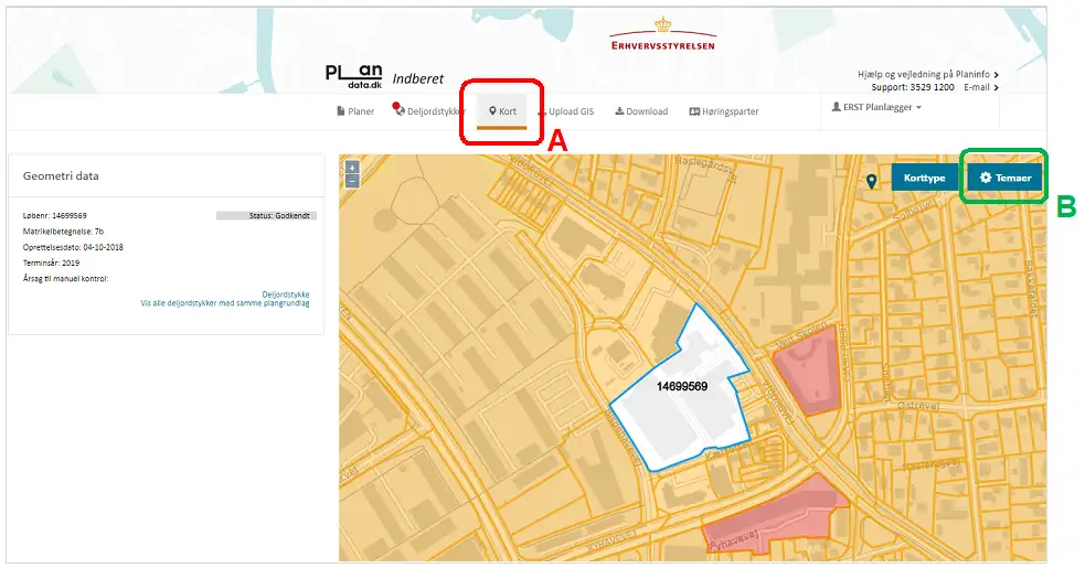 Klik på ”Kort” i topmenuen, Figur 9, A. I ”Temaer” er det muligt at vælge at få deljordstykker vist Figur 9, B. For at kunne tilgå deljordstykkerne skal der både sættes flueben i kolonnen med ”Kan vælges” og ”Kan vises”. På kortet vil godkendte deljordstykker være markeret med gul og ikke-godkendte deljordstykker med rød.