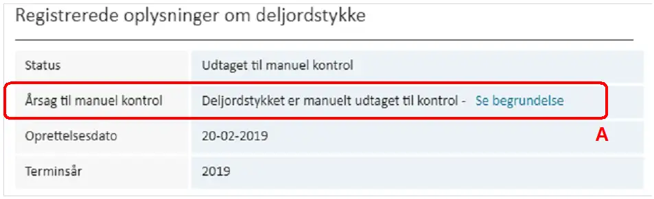 Klik ”Vis deljordstykke” i højre side af oversigten over deljordstykker, for at blive ledt videre til en side, der viser, hvilke oplysninger, der er knyttet til det enkelte deljordstykke, Figur 4, A.
