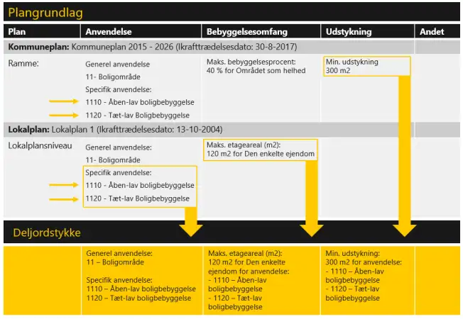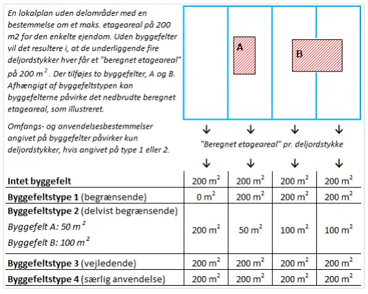 Med udgangspunkt i de nedbrudte omfangsbestemmelser på et deljordstykke, oplysninger om eksisterende bebyggelse fra BBR samt deljordstykkets størrelse, fastlægges et ”beregnet etageareal”. Det beregnede etageareal er en vejledende indikation af, hvor meget der må bebygges inden for deljordstykket.