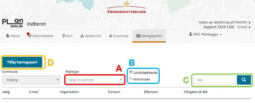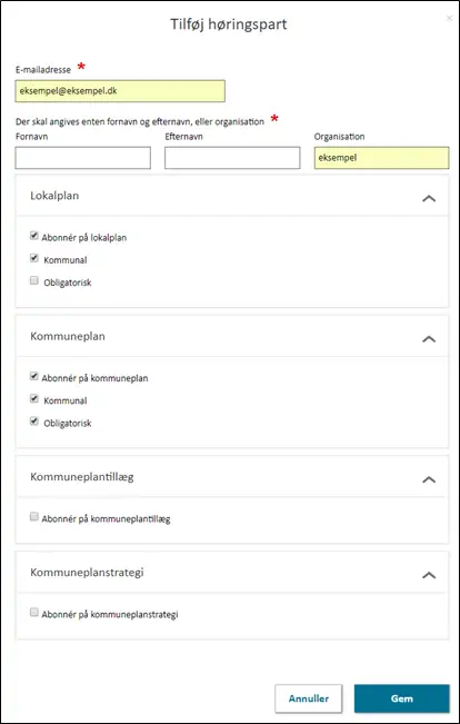 Derudover skal det angives hvilke plantyper høringsparten abonnerer på. For plantyper som høringsparten abonnerer på, skal det desuden angives om høringsparten er kommunal for denne plantype. For de fleste brugere vil høringsparter altid være kommunale for de plantyper som høringsparten abonnerer på. Valgmuligheden er primært henvendt til brugere, som administrerer landsdækkende høringsparter.