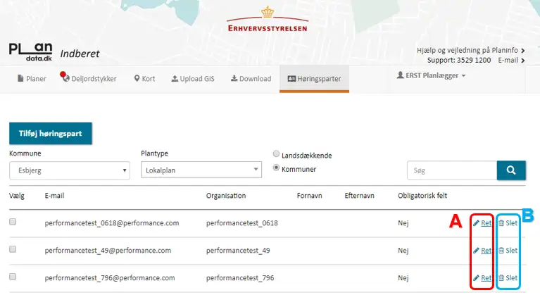 For at slette en høringspart fremsøges den relevante høringspart efter fremgangsmåden beskrevet i afsnit 2, og der klikkes på ”Slet” (Figur 4, B). Dette åbner en dialogboks hvor det er muligt at be- eller afkræfte om det ønskes at slette planen. Klik ”Godkend” for at slette høringsparten.