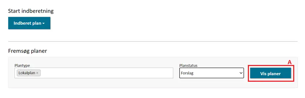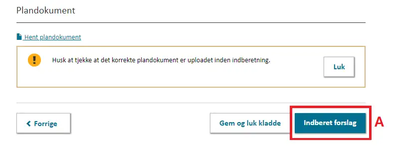 Lokalplanen kan indberettes som forslag, når alle obligatoriske felter er udfyldt. Dette gøres ved at klikke ”Indberet forslag” nederst på Trin 6, Figur 4, A.