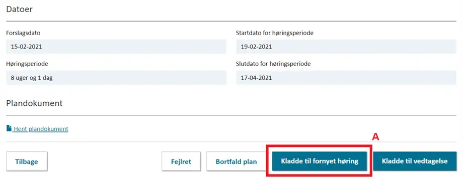 Før planen (eller -tillægget) kan sendes i fornyet høring, skal den nye forslagsdato samt den nye startdato og slutdato for høringsperioden angives, samt uploades et nyt plandokument. Det er desuden muligt at tilføje en supplerende meddelelse til høringsmeddelelsen der udsendes, som f.eks. kan orientere høringsparterne om, hvorfor planen sendes i fornyet høring, og hvad der er ændret.