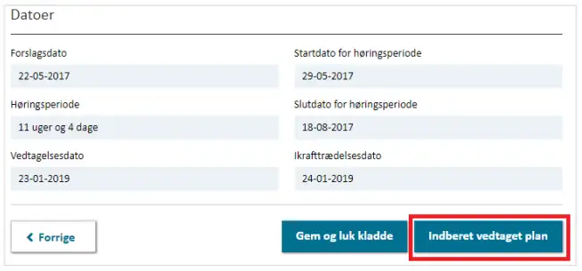 Efter at høringsperioden er slut, kan planen tilrettes og gøres klar til vedtagelse. Dette gøres i ”Kladde til vedtagelse”. Her er det muligt at ændre i de registrerede oplysninger (under hensyntagen til planlovens krav om at større ændringer mellem forslag og vedtagelse kan udløse behov for ny høring). Kladden er kun synlig for kommunen og tillader en løbende opdatering af planen, da det er muligt at gemme inden at alle obligatoriske felter er udfyldt. Dette gøres ved at trykke ”Gem og luk kladde” (se Figur 6).
