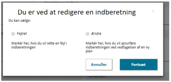 Der er to muligheder, som gør det muligt at redigere indberetningen af en vedtaget plan, der er trådt i kraft (se Figur 7).