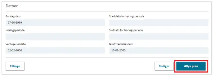 ikrafttrædelsesdatoen og dags dato. Planen bliver nu offentliggjort som en aflyst plan, og de markerede høringsparter får tilsendt en e-mail om planens statusskift.