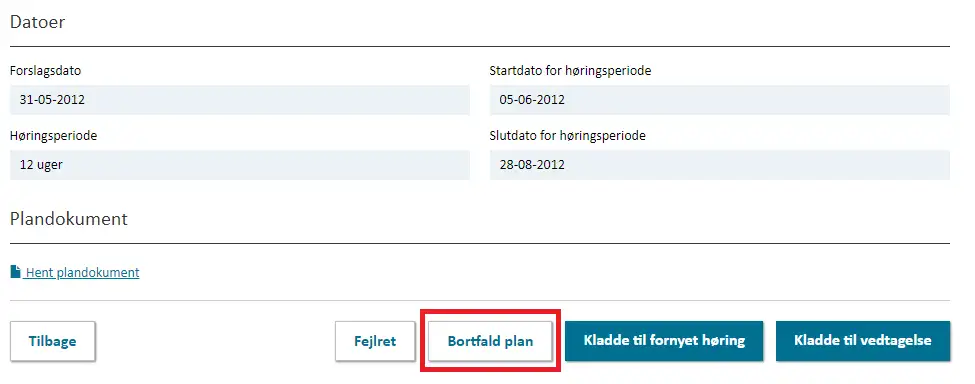 Et forslag til en plan aflyses ikke, men bortfalder, da den aldrig har været vedtaget. Et forslag til en plan kan aflyses i Plandata.dk ved at klikke på ”bortfald plan” (se Figur 9), som findes nederst på overblikssiden over planen.