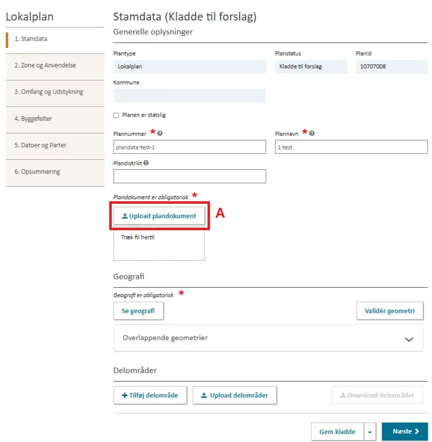 Figur 6. Indbertningsflowet i Plandata.dk. Obligatoriske felter er markeret med en rød stjerne *. PlanID, plannummer, plannavn og geografi er gemt det tidligere forslag.