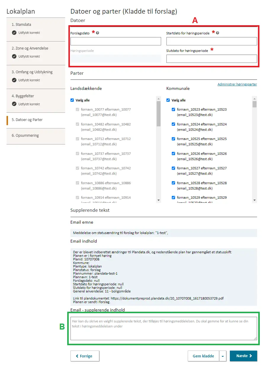Før lokalplanen kan sendes i fornyet høring, skal den nye forslagsdato samt den nye startdato og slutdato for høringsperioden angives, Figur 14, A. Det er desuden muligt at tilføje en supplerende meddelelse til høringsmeddelelsen der udsendes, hvor man fx kan orientere høringsparterne om, hvorfor planen sendes i fornyet høring, og hvad der er ændret, Figur 14, B.