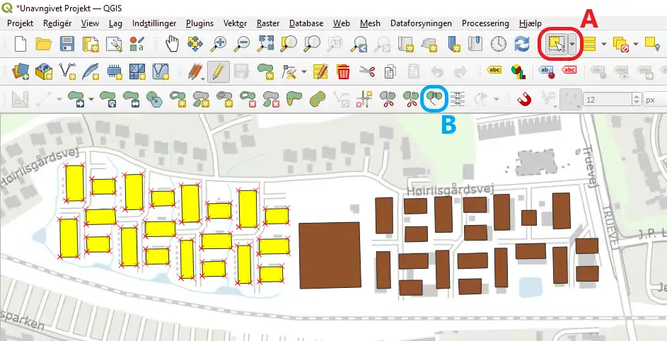 Hvert polygon repræsenterer i øjeblikket et individuelt byggefelt, men kommunen ønsker, at nogle af polygonerne skal indberettes som ét samlet byggefelt. Kommunen anvender derfor GIS-programmets flette-funktion til at danne et multipolygon. I QGIS vælges først de pågældende polygoner (A), og derefter trykkes der på Flet valgte objekter (B):