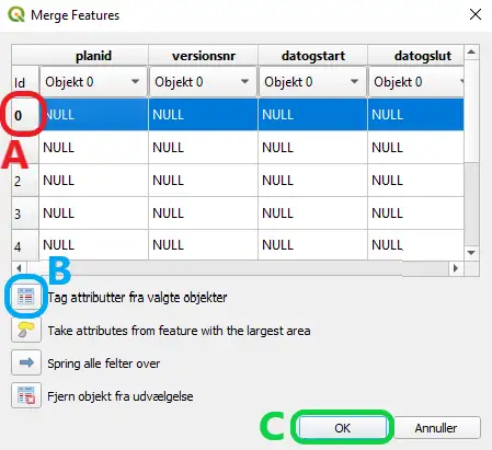 I dette tilfælde er attributterne ens for alle polygoner, og kommunen har ikke udfyldt tabellen endnu. Derfor vælger kommunen blot at anvende attributterne fra Objekt 0: