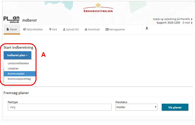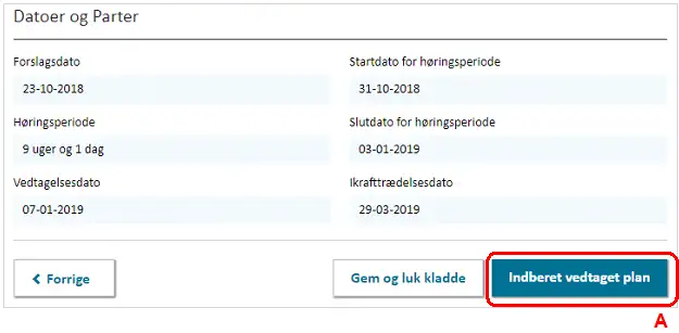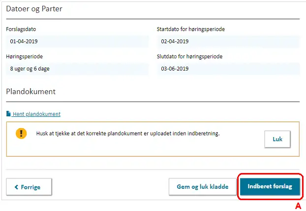 Kommuneplanen kan indberettes som forslag, når alle obligatoriske felter er udfyldt. Dette gøres ved at klikke ”Indberet Forslag” nederst på Trin 5, Figur 20, A.