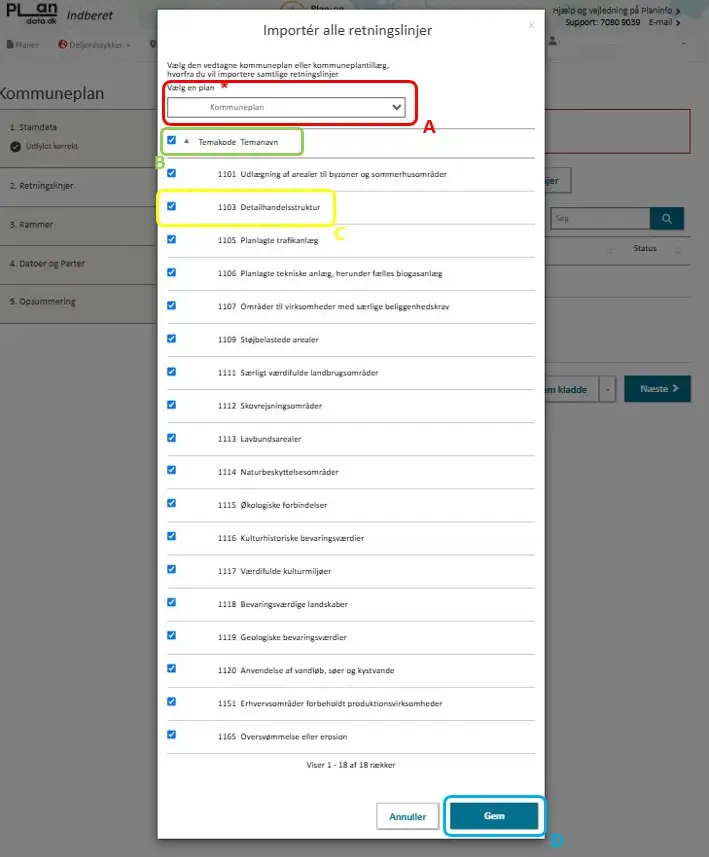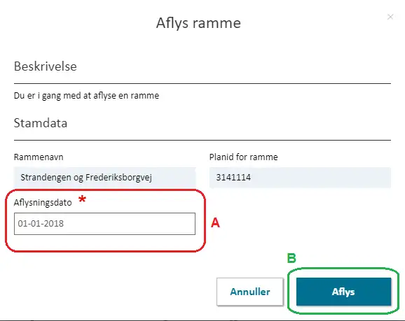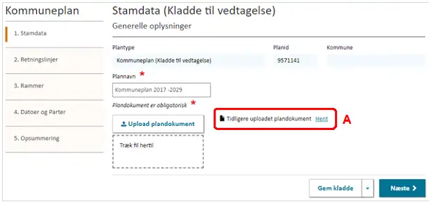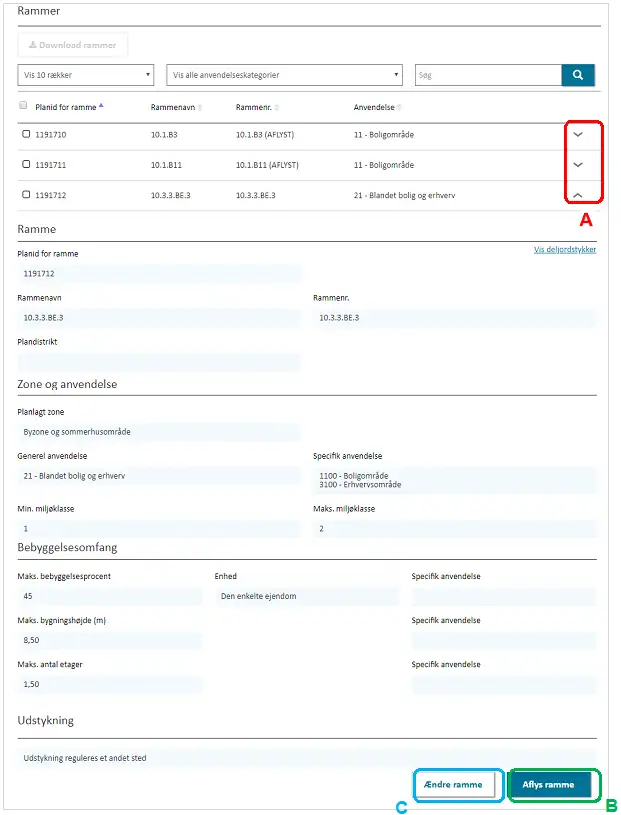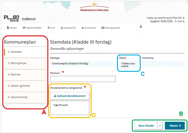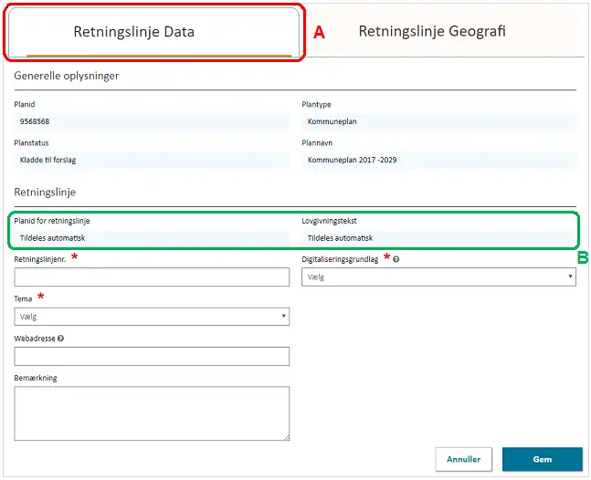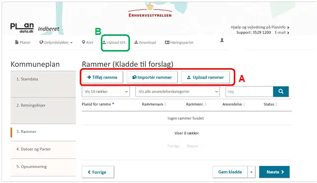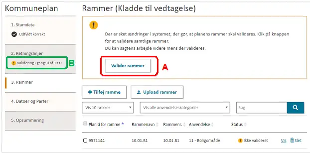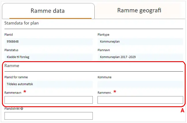 Alle rammer tildeles automatisk et unikt planid imens at kommunen selv angiver ”Rammenavn” og ”Rammenr.” Figur 11, A.