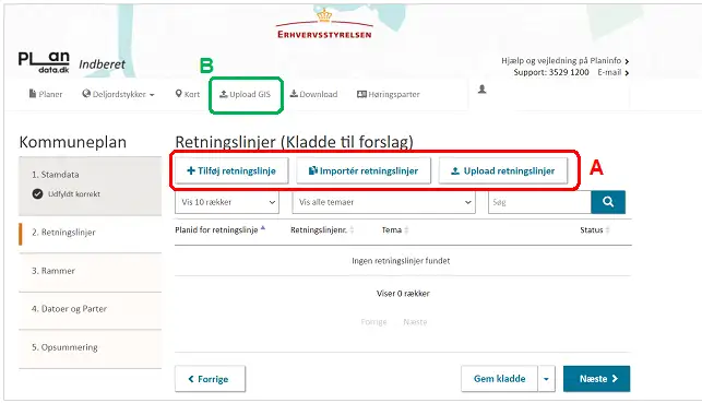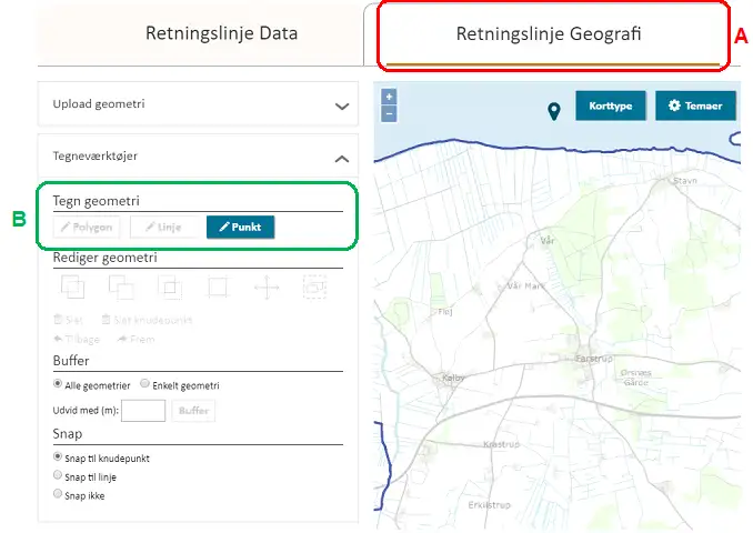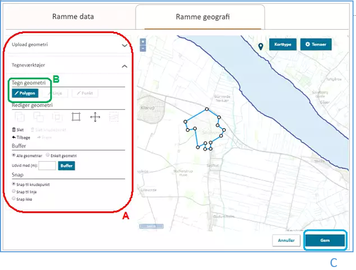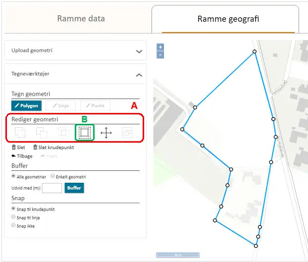 Inden rammen gemmes, skal rammens geografi indberettes, Figur 17. Rammens geometri kan enten tegnes direkte i Plandata.dk ved at bruge tegneværktøjet eller uploades under fanen ”Upload geometri”, Figur 17, A. For at tegne en geometri, vælg ”Tegn geometri”, Figur 17, B.