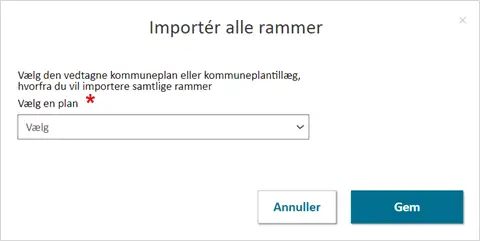 Vælges ”Tilføj rammer” skal alle obligatoriske felter være udfyldt før kladden til rammerne er færdigregistreret. Disse er markeret med en rød stjerne *.