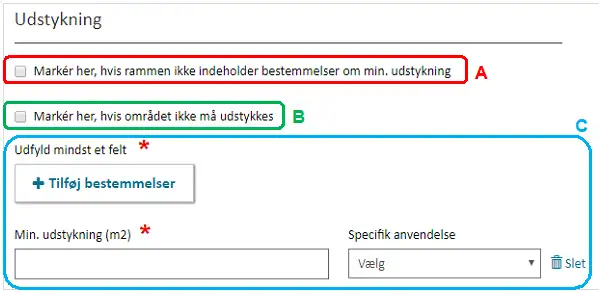 Regulerer rammen ikke et mindste udstykningsareal, sættes flueben i ”Marker her, hvis rammen ikke indeholder bestemmelser om min. udstykning”, Figur 14, A. Må området ikke udstykkes, sættes flueben i ”Marker her, hvis området ikke må udstykkes, Figur 14, B.