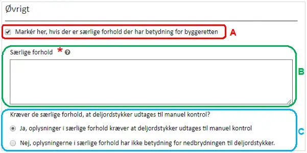 Angives der ”Særlige forhold” for en ramme, skal det angives, hvorvidt oplysningerne skal føre til, at deljordstykker, der er relateret til rammen, skal udtages til manuel kontrol, Figur 16, C. Hvis de særlige forhold angiver, at der inden for rammens geometri gælder bestemmelser, som afviger fra de øvrige registrerede bestemmelser – eksempelvis at der for ét jordstykke (matrikel) gælder en anden bebyggelsesprocent end for det øvrige rammeområde – kan det markeres at deljordstykkerne skal udtages til manuel kontrol. Herved får kommunens planlægger mulighed for at korrigere bestemmelsen for (del)jordstykket.