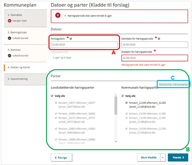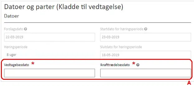 Figur 18. Forslagsdato samt startdato og slutdato for høringsperioden skal angives under Trin 4: Datoer og Parter.