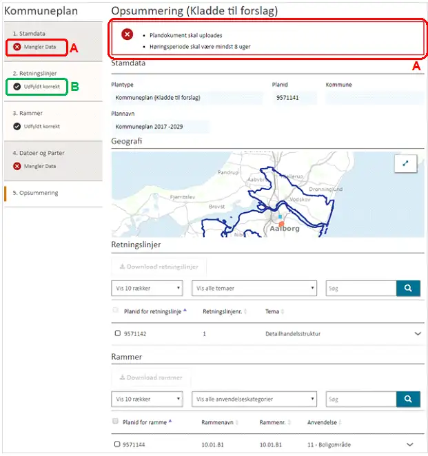 Trin 5 viser en opsummering af de registrerede oplysninger i Trin 1-4. Er der en mangelfuld registrering i forhold til de obligatoriske felter, vises dette med et rødt kryds ud for trinnet sammen med en beskrivelse, Figur 19, A. Er alle obligatoriske felter udfyldt markeres dette med ”Udfyldt korrekt” ud fra hvert trin, Figur 19, B.