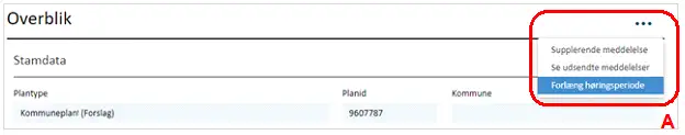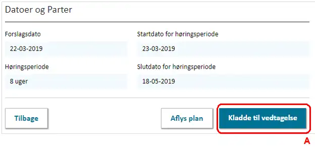 Før kommuneplanen kan sendes i forslag, skal der angives forslagsdato samt start- og slutdato for høringsperioden. Når datoerne er registreret, vil feltet ”Høringsperiode” angive høringsperioden i uger og dage, Figur 18, A. Høringsperioden for kommuneplaner skal være mindst 8 uger. Se mere i planlovens kapitel 6.