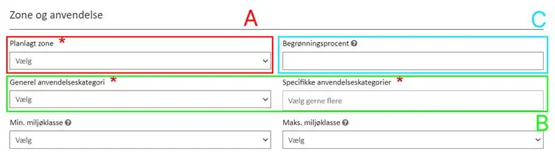 En kommuneplanramme regulerer zone (byzone, landzone og sommerhusområde), som vælges i dropdown-menuen, Figur 12, A. Derudover er det obligatorisk at angive en generel anvendelseskategori samt specifikke anvendelseskategorier for rammen (Figur 12 B).