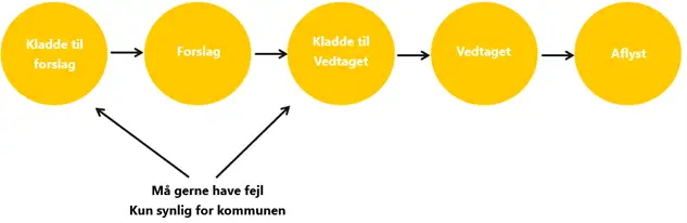 Når kommuneplanstrategien oprettes, har den status ”Kladde til forslag”. Når kommuneplanstrategien er i status ”Kladde” er den ikke synlig for offentligheden, og det er muligt løbende at lukke og gemme registreringerne i Plandata.dk inden at alle obligatoriske felter er udfyldt. Obligatoriske felter er markeret med en rød stjerne *. En kladde kan desuden slettes.