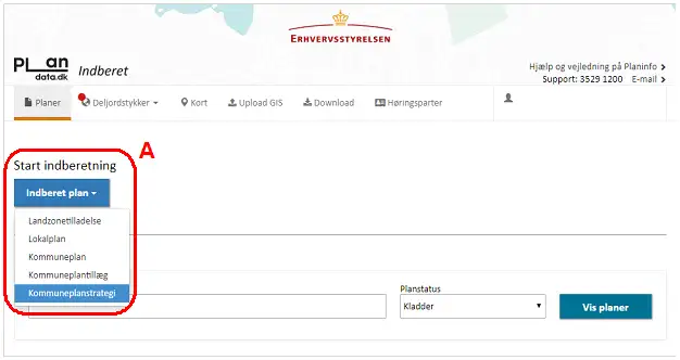 For at indberette en kommuneplanstrategi, klikkes på ”Indberet plan” på forsiden af Plandata.dk og plantypen ”Kommuneplanstrategi” vælges fra dropdown-menuen, Figur 2, A. Dette åbner Plandata.dk’s indberetningsflow.