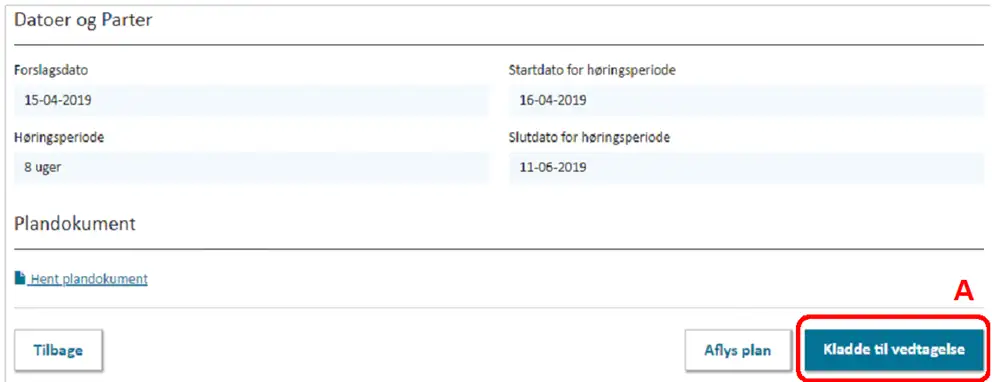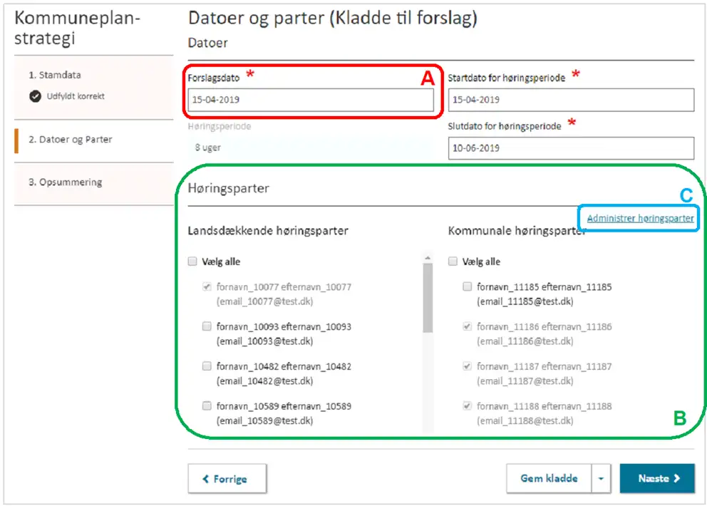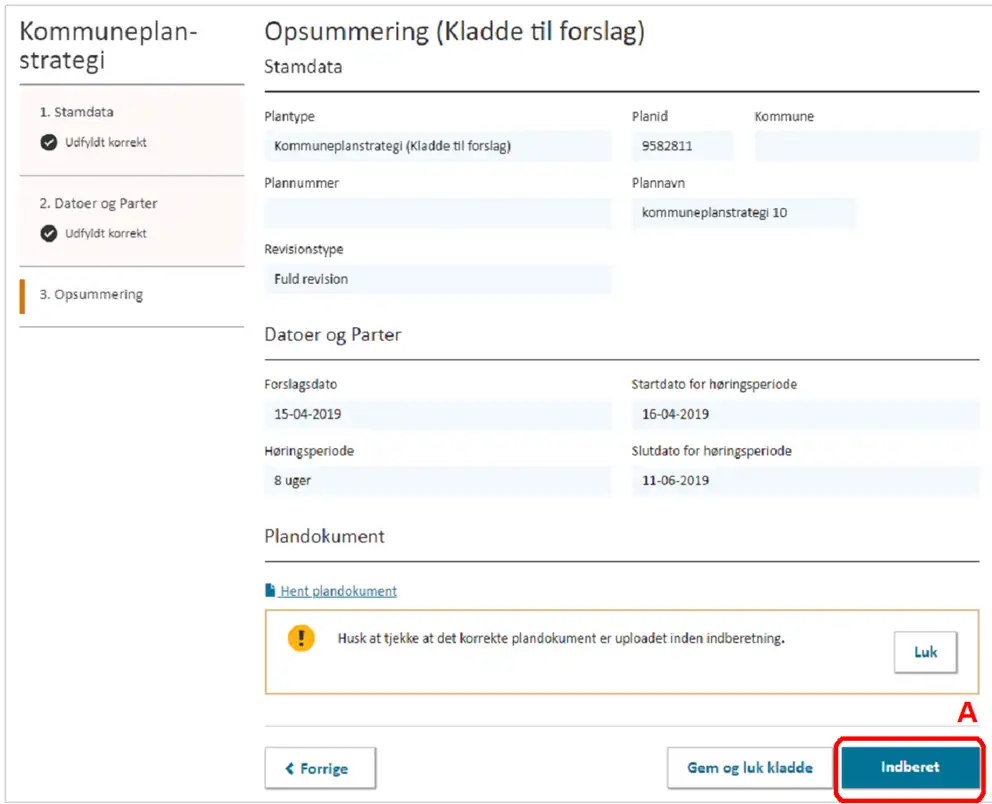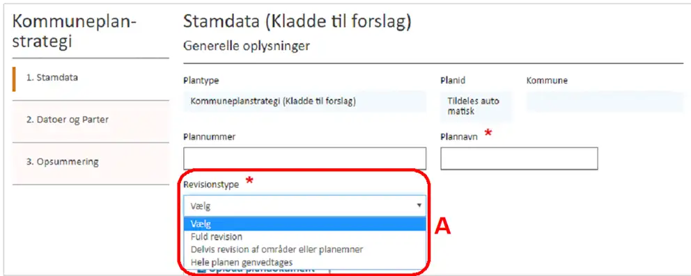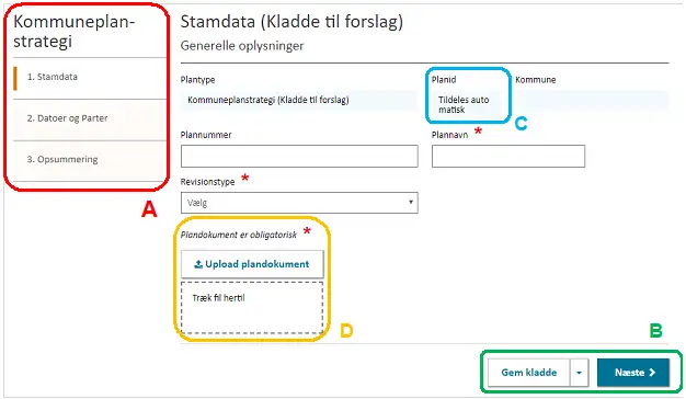 Ved oprettelse af kommuneplanstrategi registreres generelle oplysninger kaldet stamdata. Første gang kladden gemmes, tildeles den automatisk et unikt planid, Figur 3, C. Planid’et kan ikke ændres, og det vil følge kommuneplanstrategien i hele dens livsforløb. Planid’et kan løbende bruges til at identificere den konkrete kommuneplanstrategi.