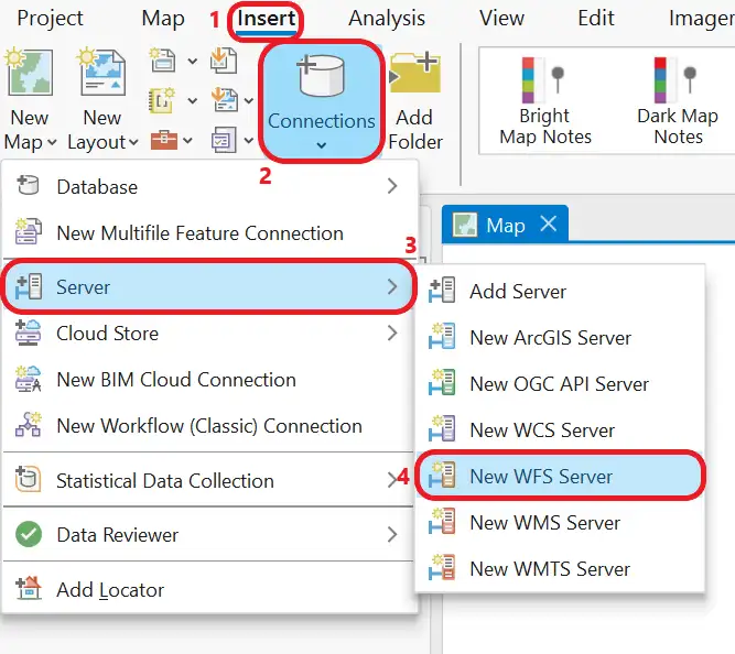 Start ArcGis Pro og klik på Insert i øverste hovedmenu → Vælg Connections → Server → New WFS Server for at tilføje en WFS.