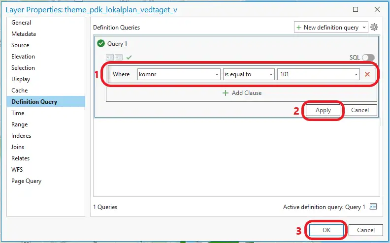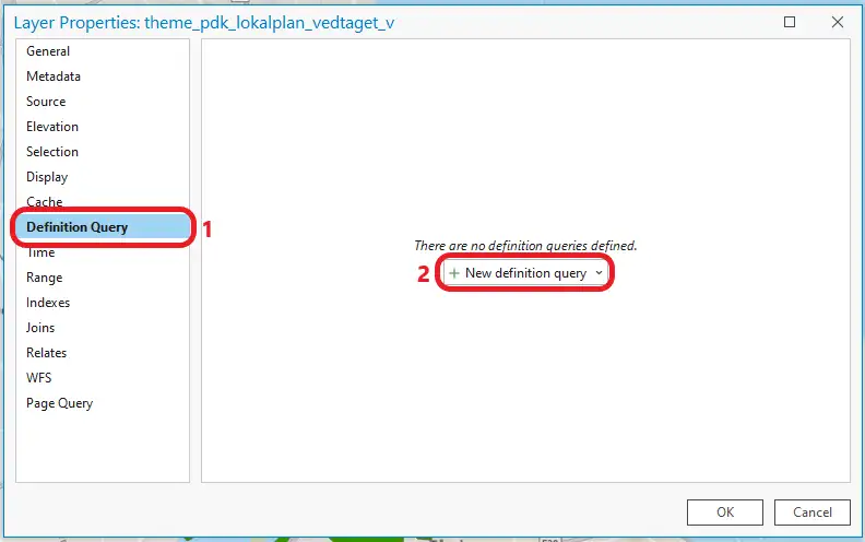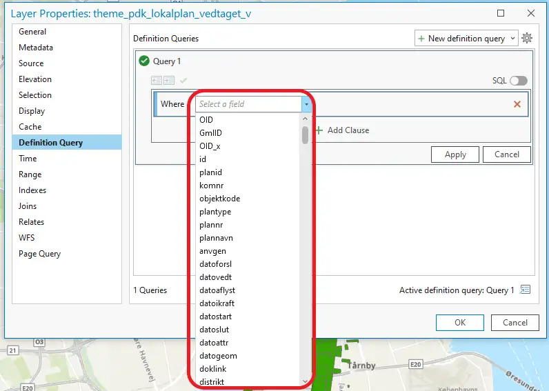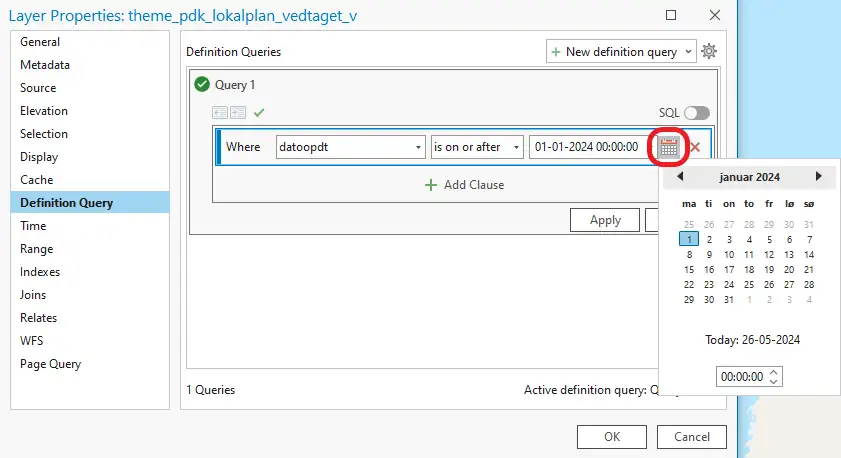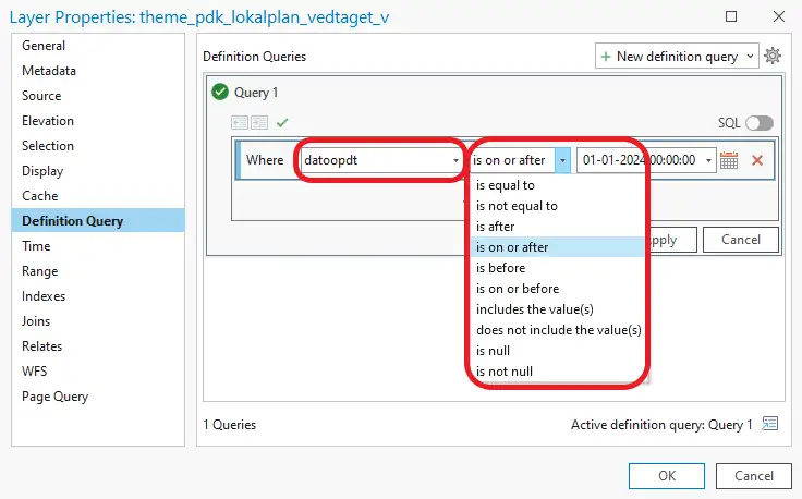 Når du har oprettet forbindelse til WFS’en og har tilføjet et lag, højreklikker du på laget i Contents → Properties → Definition Query → New definition query → Vælg det tidsfelt, du ønsker at filtrere efter, f.eks. datoopdt, der angiver, hvornår en plan er opdateret → Vælg derefter, hvordan du vil filtrerer. I eksemplet herunder er der f.eks. valgt is on or after, så filtreringen sker på og efter den angivne dato: