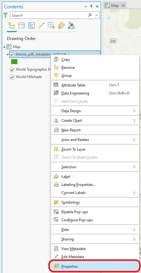 Efter der er skabt forbindelse til webservicen, kan du tilføje de ønskede lag til dit kort. Laget finder du i Contents i venstre side, og du er nu klar til at lave den geografisk afgrænsede søgning → Højreklik på laget → Vælg Properties: