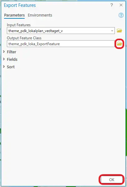 Vælg, hvor filen skal gemmes, og hvad filen skal hedde, ved at klikke på mappen ud for Output Feature Class: