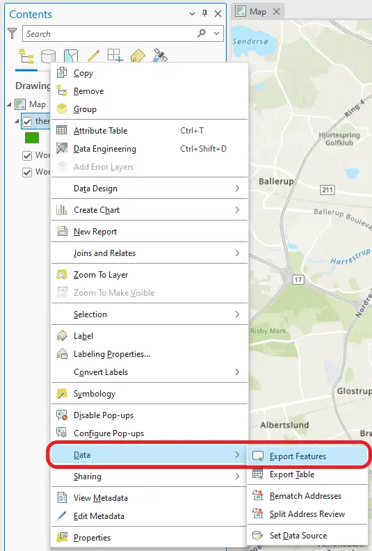 Dette gøres ved at højreklikke på laget i venstre side af vinduet og vælge Data → Export features: