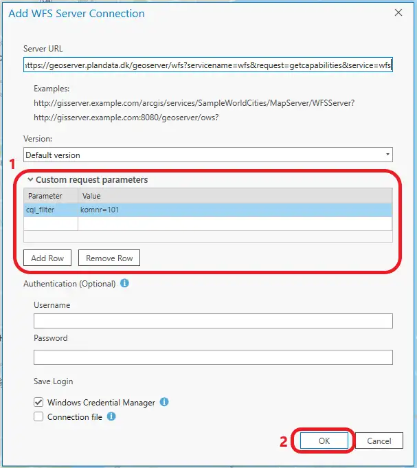 Ved du allerede fra starten, at du kun vil arbejde med data fra én bestemt kommune eller flere bestemte kommuner, kan du ved tilføjelse af WFS-servicen angive, hvilke(n) det drejer sig om. Når du tilføjer den ønskede WFS som beskrevet ovenfor, skal du i pop up-vinduet Add WFS Server Connection udvide sektionen Custom request parameters.