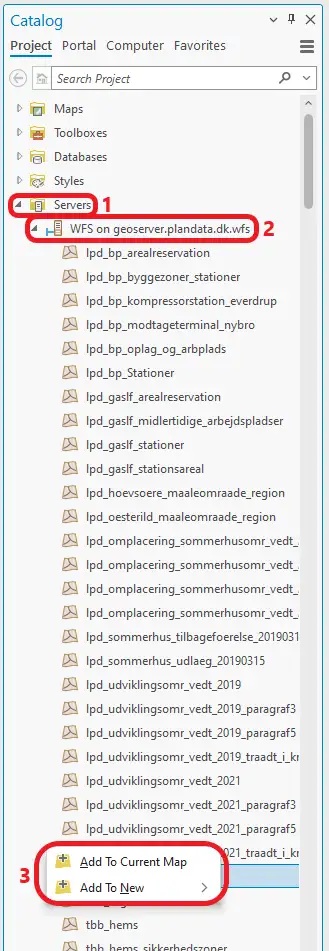 Efter der er oprettet forbindelse, kan du finde den tilknyttede server under Servers i Catalog Pane i højre side af vinduet. Her højreklikker du på de ønskede temaer og vælger Add to new map eller Add to current map:
