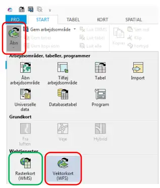 Under fanen ”Start” findes knappen ”Åbn” og herefter kan man vælge mellem WFS og WMS.